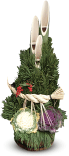 - confezionamento di decorazioni fatte di pezzi di bambù, rami di pino e corde intrecciate a mano (da mettere sopra la porta per tenere lontani gli spiriti cattivi) (kadomatsu).